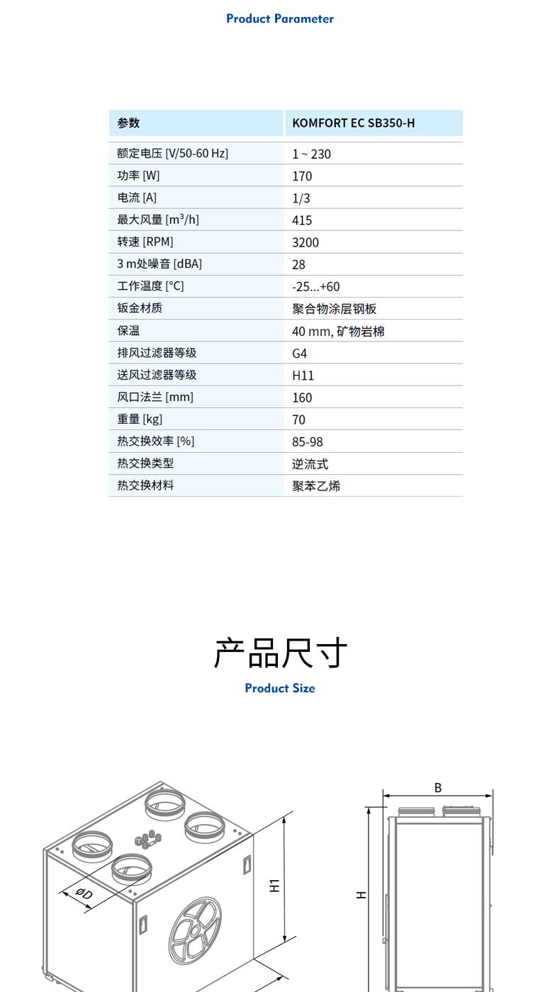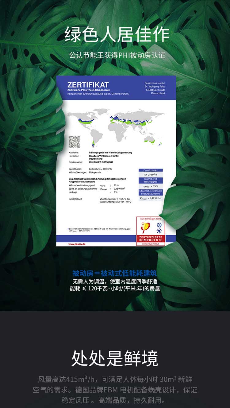 ● 風量高達415m3/h,滿足人體每小時30m3新鮮空氣的需求。