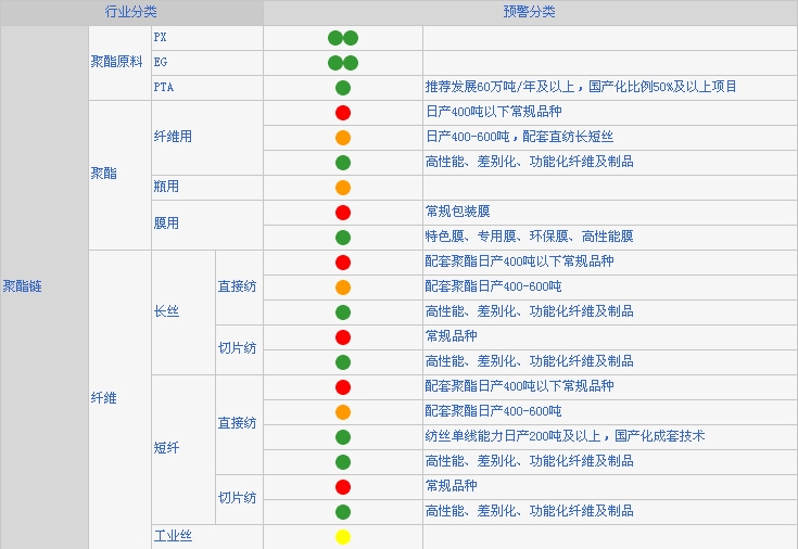 本預警系統監測的品種涵蓋化纖行業主要產品,分為紅、橙、黃、綠、雙綠五種類別,分別代表風險極大,風險較大、有一定風險、鼓勵發展、重點扶持。可以結合預警類別及內容,根據企業生產經營實際情況進行判斷。